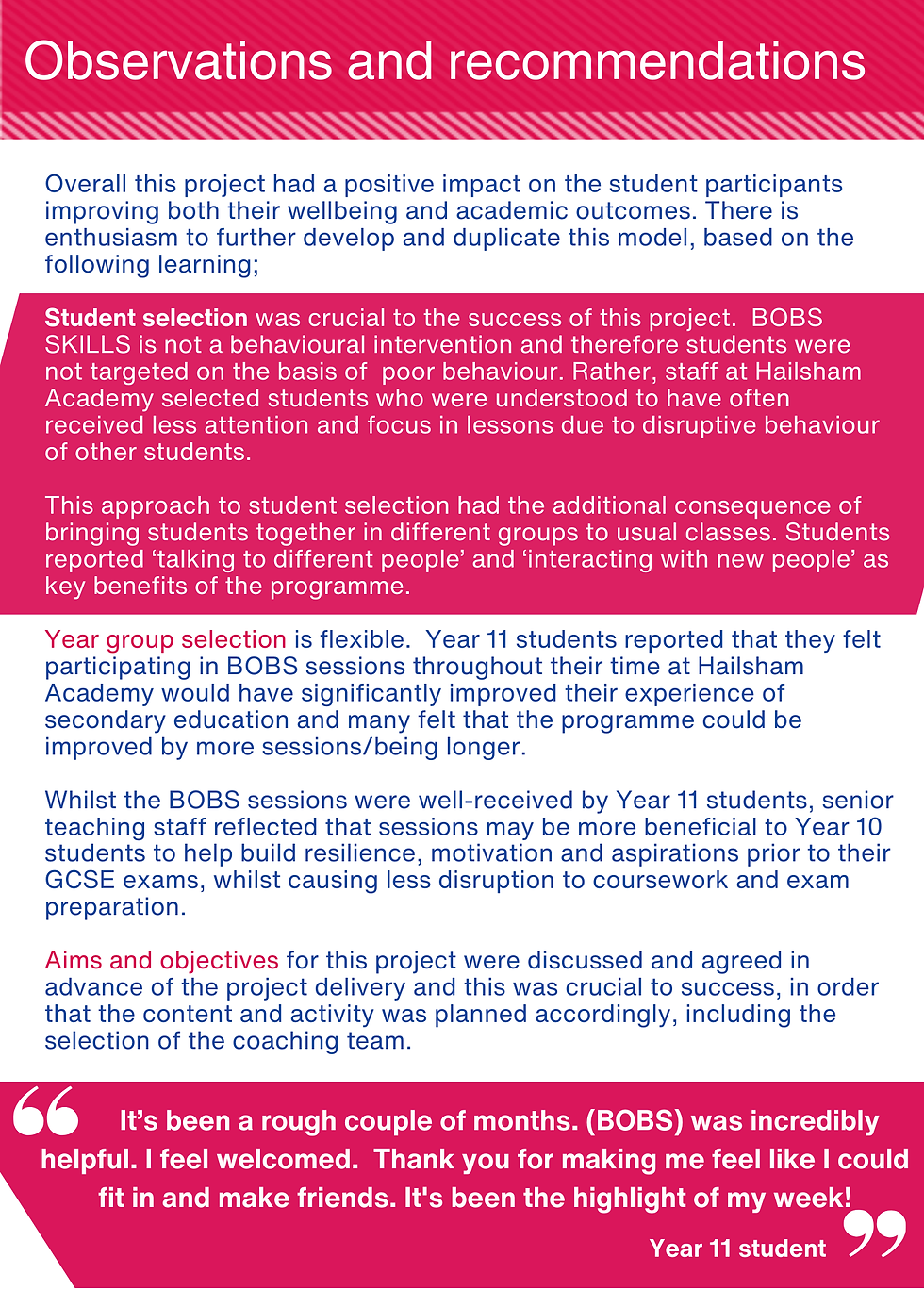 The Being Our Best Selves (BOBS) Skills programme supports young people to tackle real and significant challenges in their lives, including: